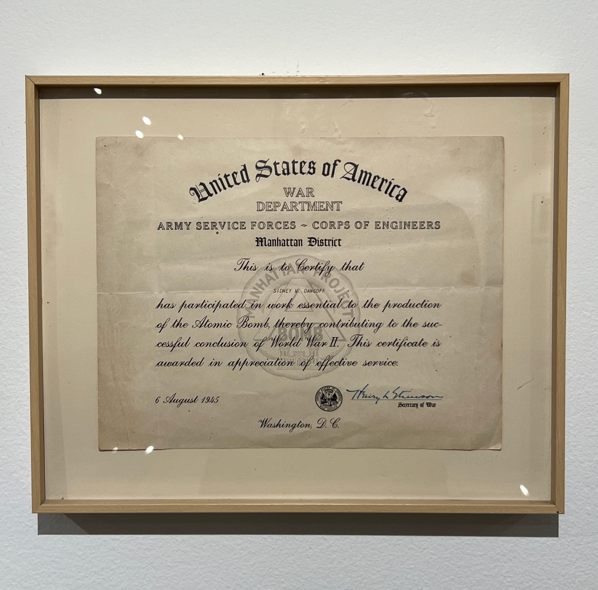 Judith Dancoff’s archival certificate from the US Department of War to her father, Sidney Dancoff (photo by Austen Villacis/Hyperallergic)