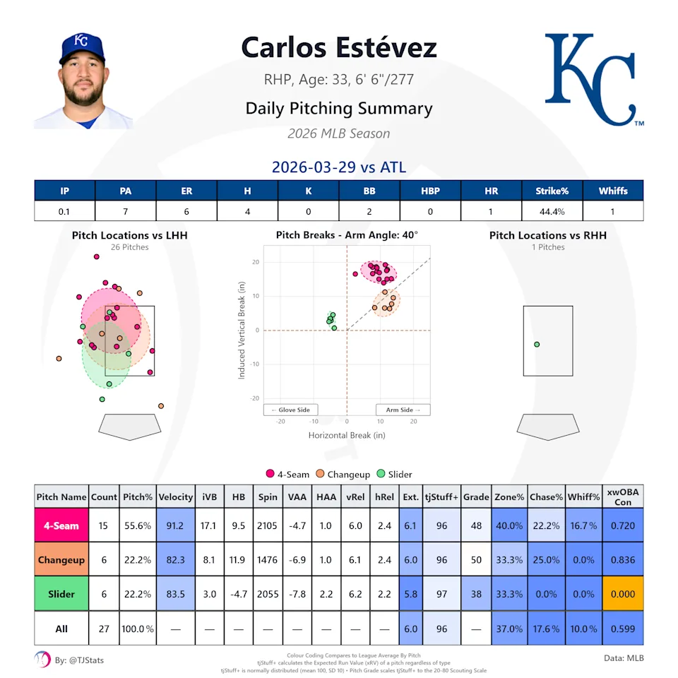Carlos Estévez currently has a 162.02 ERA and a 60.00 FIP. He allowed four hits and two walks in the third inning. Nor were the punishments cheap; all four were considered hard hit. Three were over 100 MPH exit speed. You don’t want to overplay one game, but this is a game that’s pretty similar to everything we’ve seen during Spring Training. I’m not ready to write off Estévez as a viable reliever, but he won’t be close until his velocity and command return.