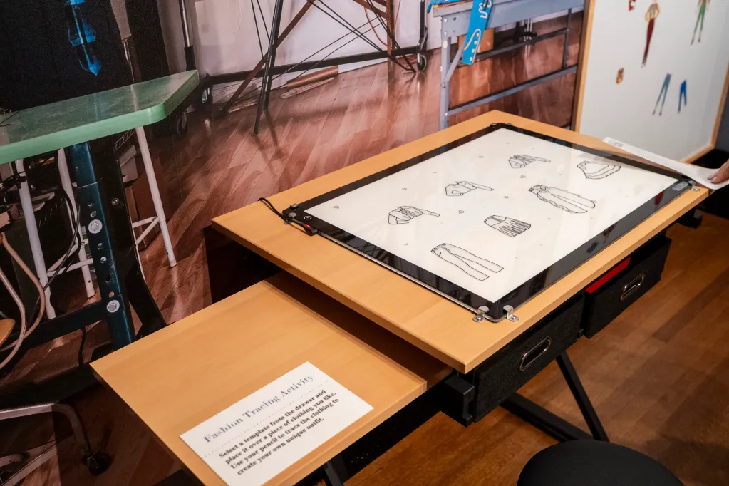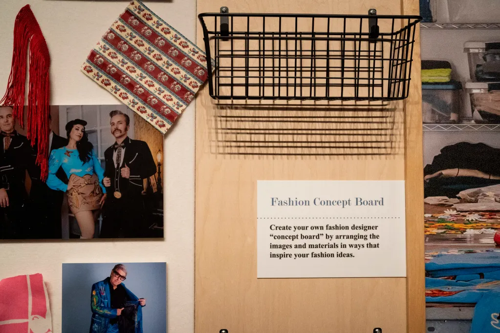 A modern table and fashion concept board invites visitors to draw while exploring “The Fashion of Jerry Lee Atwood,” on display at the Eiteljorg Museum through Aug. 2, 2026.